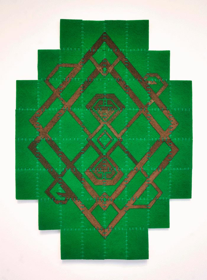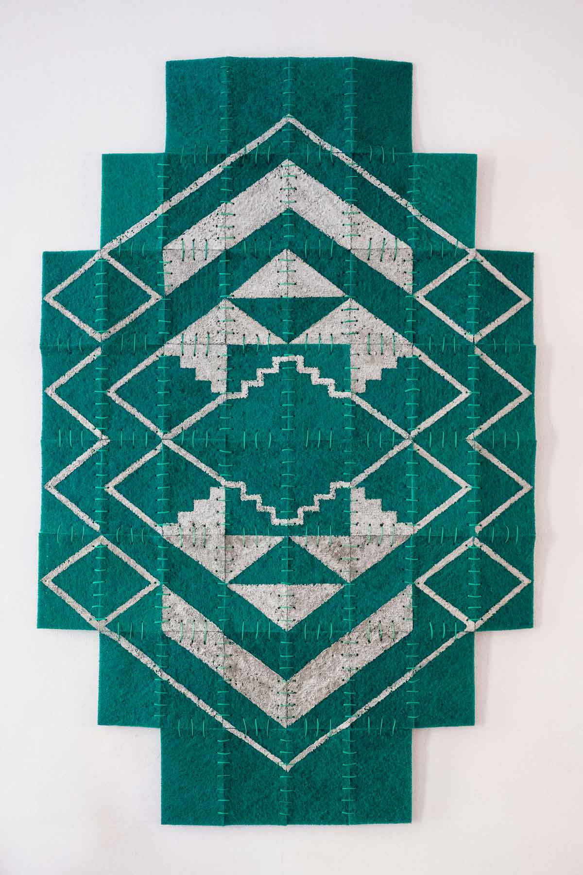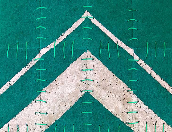 The cement acts as a pigment to draw on the sponges abstract and geometric designs that refer to aesthetics taken from patterns used in the making of Aimara and Mapuche looms present in the work Esponjas Cósmicas / Chao Londres, on the other hand in the work Tejido Abrasivo, Hola Santiago, I mix Art Deco aesthetics and patterns present in pre-Columbian looms with the aim of generating a framework of multiple readings around possible combinations, that move between opposites: ancestral life v/s contemporary, material v/s spiritual.